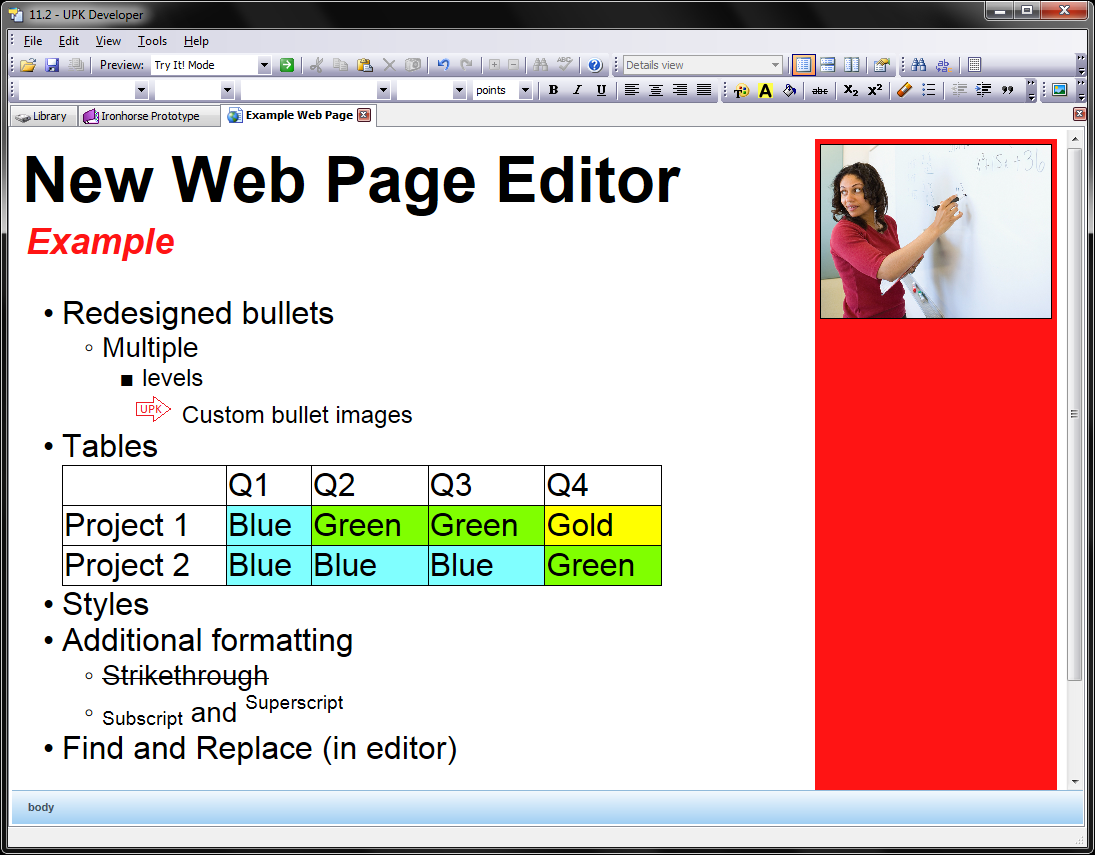 The new Web Page Editor in UPK 12.1 provides the features customers need to easily create engaging conceptual content in both online and document outputs. Add a table of data to provide users with the information they need to complete critical tasks. Create lists with multiple levels or custom bullets to add clarity or visual appeal to complex lists of items. In an ongoing effort to deliver truly single-source content creation and management supporting all phases of the software lifecycle, these features are available for both online outputs, such as the Player, as well as document outputs.
