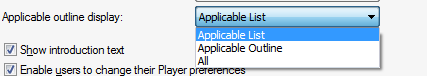 Authors may choose to display the initial view of an applicable player as an Applicable List or an Applicable Outline. Additionally, authors may choose to show the full outline (All). This is useful as it allows the authors to have more control over the initial user experience of launching content through the application help menu.
