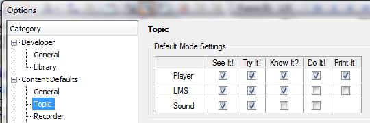 Authors may determine default topic modes for Player and LMS as well as which topic modes will include sound saving a significant amount of time configuring topics independently or in selected groups. Additionally, these values can be saved, shared, and reused as part of the content default (.OPS) file.