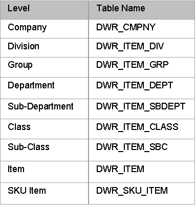 Performing Gap-Fit AnalysisCustomizing the Predefined ORDM Data Mining Models for MeddWebb (continued) The Item Merchandising hierarchy in ORDM is as follows: This existing hierarchy is implemented using a set of database snowflake tables and associated objects corresponding to each level of the hierarchy as given below: Item Merchandising Hierarchy