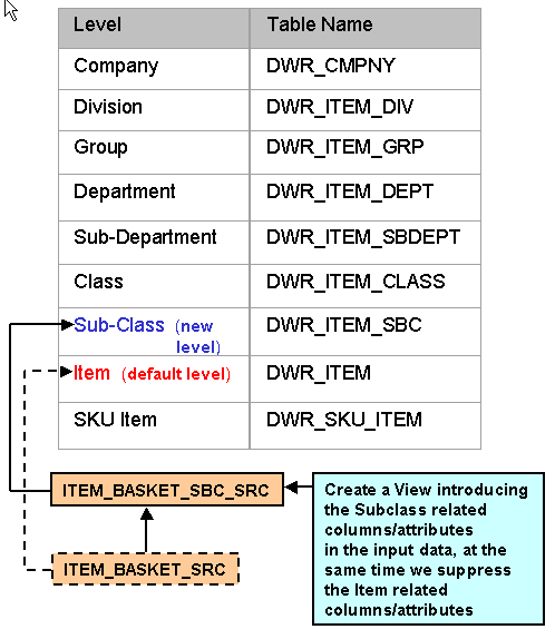 Performing Gap-Fit AnalysisCustomizing the Predefined ORDM Data Mining Models for MeddWebb (continued)Currently, for Item Basket mining models, the input data for the model building comes from the ITEM_BASKET_SRC table. Need to Change Source Data Mining Data Granularity from Item to Subclass LevelWith the default model at Item level, the source data mining data table ITEM_BASKET_SRC contains columns/attributes related to item level only (plus primary key fields and several measures). Generally, for data mining the requirement is that the input data should be available at the most granular level. Therefore, you cannot change the granularity of the data for bringing a change in the model (for going one level upward). You need to introduce the Subclass-related columns/attributes in the input data, while at the same time you need to suppress the Item-related columns/attributes from the data mining engine during the model building, so that the mining rules can be discovered at the subclass level. Create View to Add Subclass-Related Columns/Attributes and Suppress Item-Related Columns/AttributesIn order to achieve this, define an ITEM_BASKET_SBC_SRC view based on the existing source table ITEM_BASKET_SRC, keeping the data granularity the same as before. This newly defined ITEM_BASKET_SBC_SRC view will be used as the source for the modified models.