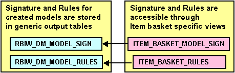 (Background Note: The Signature and Rules for the created models are stored in generic output tables RBIW_DM_MODEL_SIGN and RBIW_DM_MODEL_RULES, respectively, and they are accessible through the item basket specific views ITEM_BASKET_MODEL_SIGN and ITEM_BASKET_RULES, respectively.)