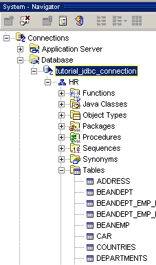 Database, tutorial_jdbc_connection, HR, and then Tables.