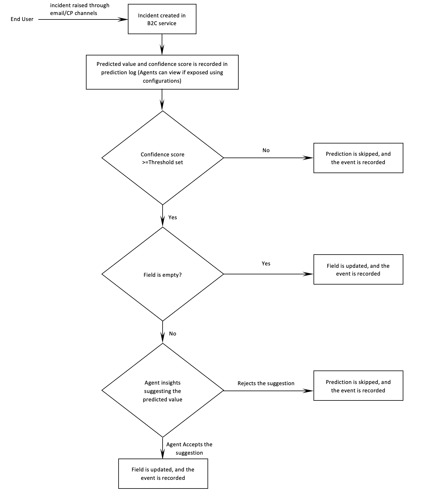 When an end-user raises an incident using email/Customer Portal webform (Email channels), the prediction flow is initiated. As of now this accelerator does not support the real-time live conversation, as it uses asynchronous CPM updates for the prediction flow, which means, the user can expect a slight delay of few seconds to a couple of minutes to see the prediction results to be updated to the incident. The flow has two major events, prediction and updation, a prediction is initiated when an incident is created, which will have a confidence score, which explains how confident the model is about the accuracy of the prediction. And updation is condition based, and it has two flows for agent: