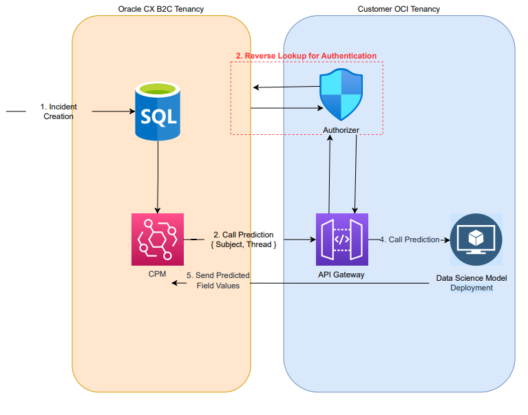 Custom model used for predicting product, category and disposition is deployed in OCI as function and is protected using API Gateway. The authentication layer in API gateway is overridden using authoriser which itself is an Oracle Function that does reverse lookup with user provided credentials to B2C Serice to authenticate the user.