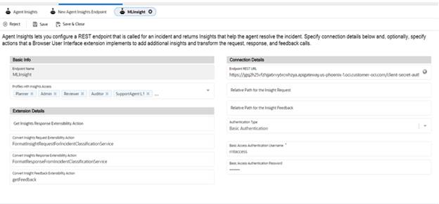 For BUI, the model endpoint is invoked by agent insight feature, while extensions are used to create transform request and response to and from the model. For the insights to call the model endpoint, the request is routed via Agent Service which in-turn pass the request to XO service. XO service call the API gateway which has an authentication function between model deployment and insight feature.