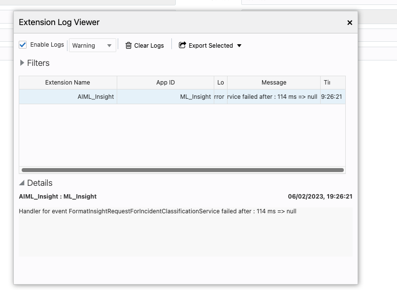 Extension log will have the extension invocation logs with any failure in handler if present in message column.