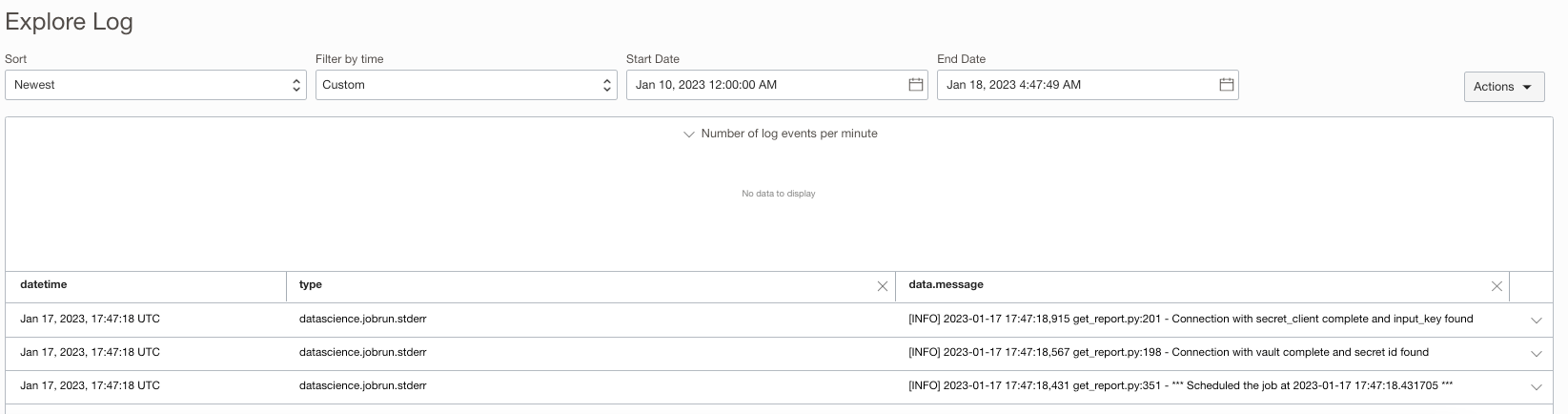 Select Ingestion Job or Scheduled Ingestion Job and click on currently active job run to see logging details. Below screenshot shows the sample log screen: