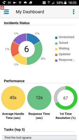 In the August 2016 release, agents can view, edit, and create incidents and contacts, and view organizations. They can also add messages and attach files to incidents, including pictures taken with the device’s camera.