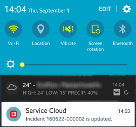 Configure push notifications You can have notifications sent to mobile device when certain events happen, such as incidents being updated. The following is an example of a push notification on an Android device. Use the following procedures to: Configure Google Android push notifications. Configure Apple iOS push notifications.
