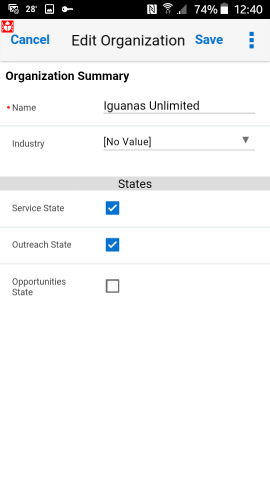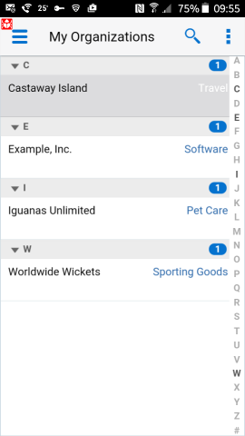 Organizations Procedure Tap Organizations in the Springboard. The My Organizations list appears. Tap an organization to view its details, or tap the Search icon () to search for organizations. Tap the Incidents or Contacts icon at the bottom of the screen to view incidents or contacts assigned to that organization, respectively. Tap the Edit icon () to add or change information for the organization. Tap Save to save the changes, or Cancel to discard the changes.