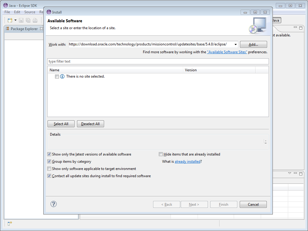 the step-by-step instructions. http://download.oracle.com/technology/products/missioncontrol/updatesites/base/5.4.0/eclipse/ Step-by-Step Instructions Before starting, make sure that you have downloaded and installed Eclipse 3.8, 4.2, 4.3 or 4.4. |