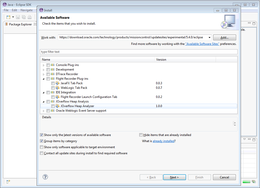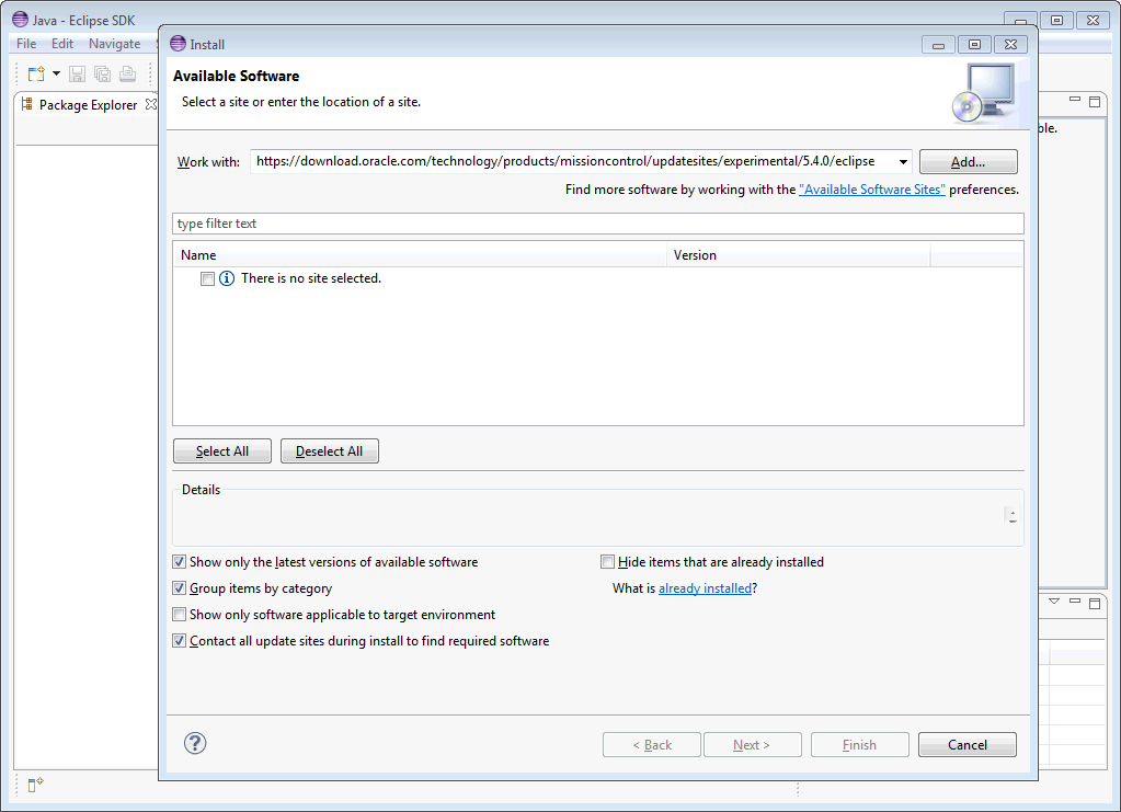 the step-by-step instructions. http://download.oracle.com/technology/products/missioncontrol/updatesites/experimental/5.4.0/eclipse/ Step-by-Step Instructions Before starting, make sure that you have downloaded and installed Eclipse 3.8, 4.2, 4.3 or 4.4 and installed the Java Mission Control base Plug-ins. |