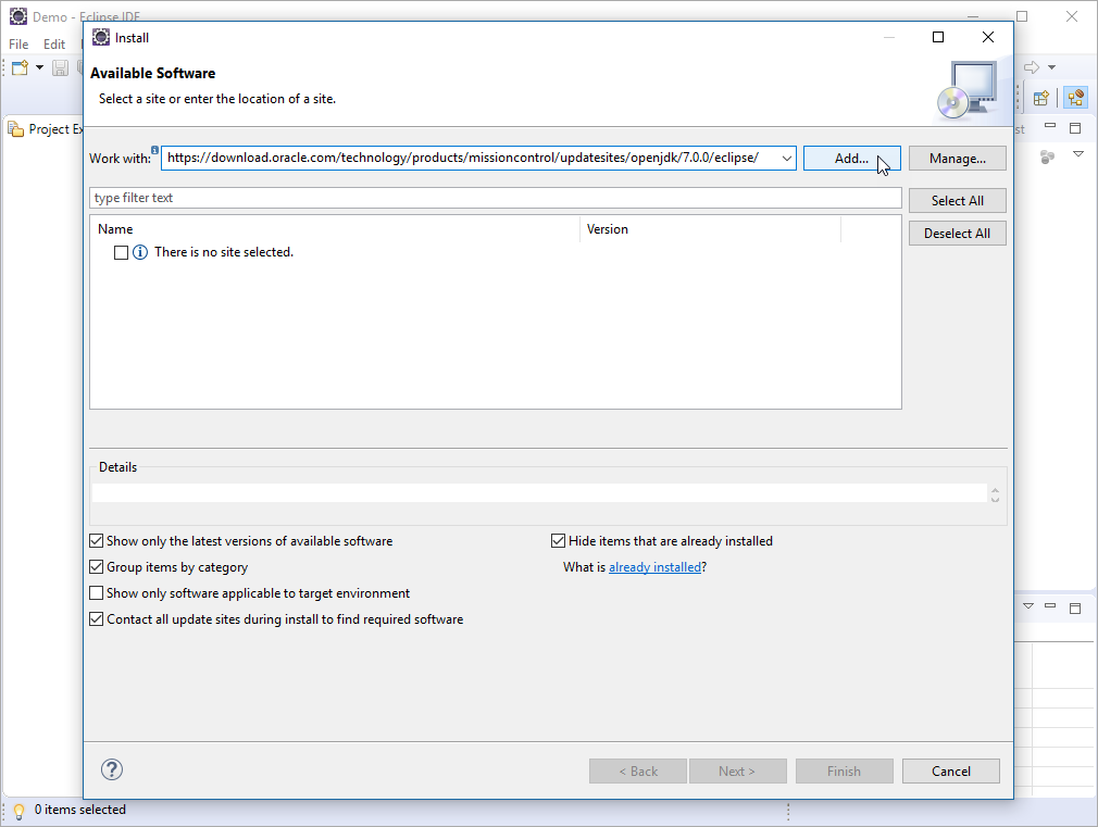 the step-by-step instructions. https://download.oracle.com/technology/products/missioncontrol/updatesites/openjdk/7.0.1/ide/ Step-by-Step Instructions Before starting, make sure that you have downloaded and installed Eclipse 4.8 or later. |